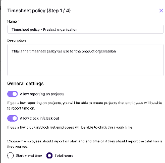 You will see a tab with timesheet policies and one for projects. To create a new policy, press the button “New timesheet policy”