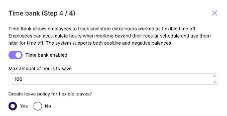 Enable time bank: Select if a time bank should be enabled. Time Bank allows employees to track and store extra hours worked as flexible time off. Employees can accumulate hours when working beyond their regular schedule and use them later for time off. The system supports both positive and negative balances.