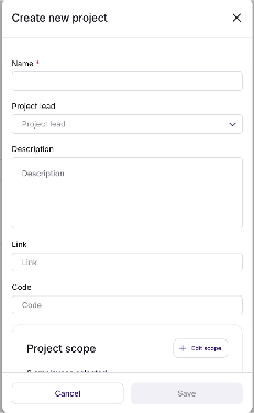 - Add scope: which employees should be able to report on the project. The project is only visible to the people in the scope.