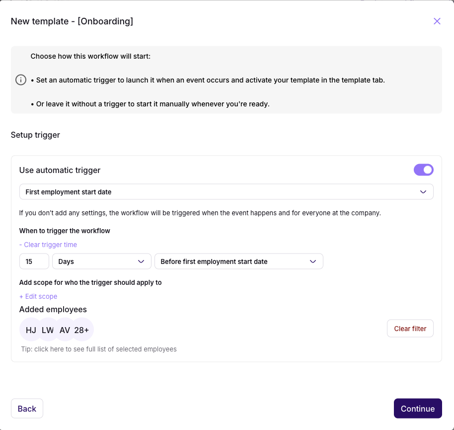 - If this is an automatic template, define the scope to control which employees the workflow applies to: