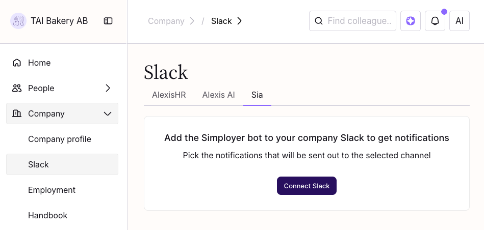 Click Connect Slack. You must be an Owner or Admin in Simployer One to activate the integration