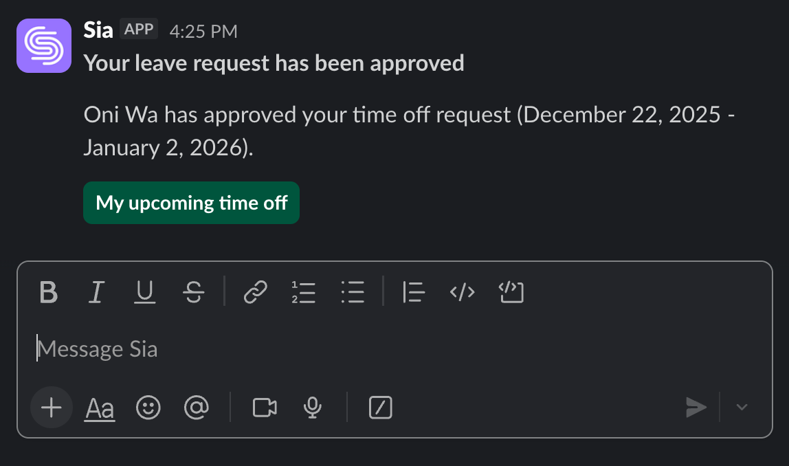 If an employee submits a leave request, Sia can notify you right away in Slack. You can approve or deny the request directly in the message.