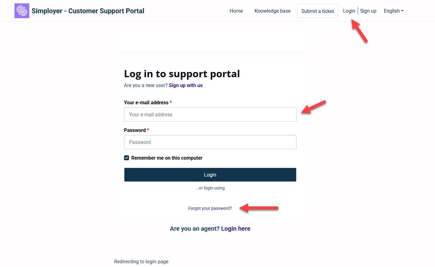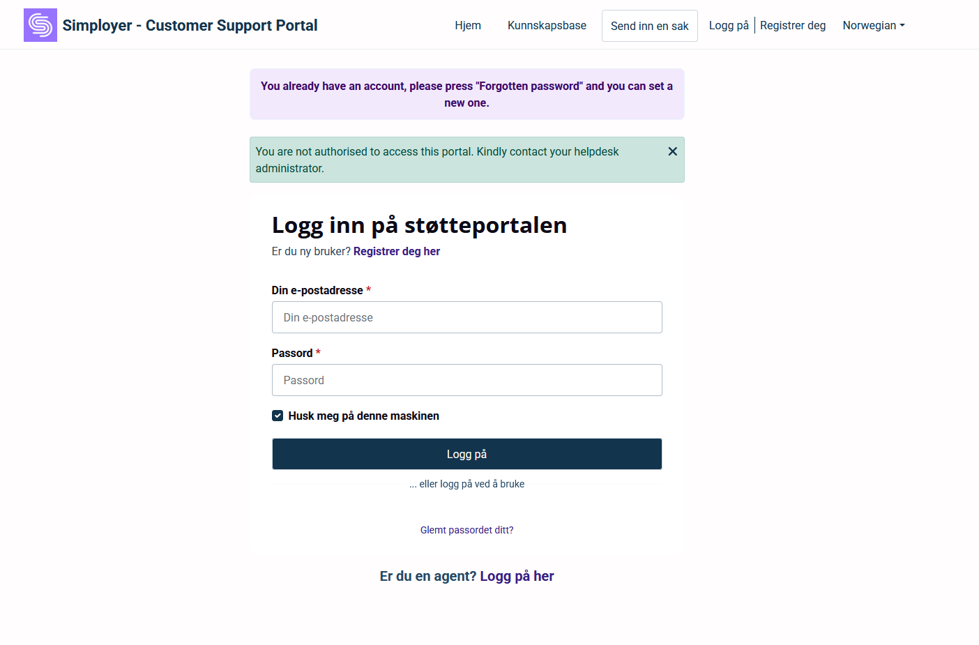 Vær oppmerksom på at innloggingsdetaljene til Customer Support Portal ikke er de samme som til Simployer-løsningen du bruker til daglig.