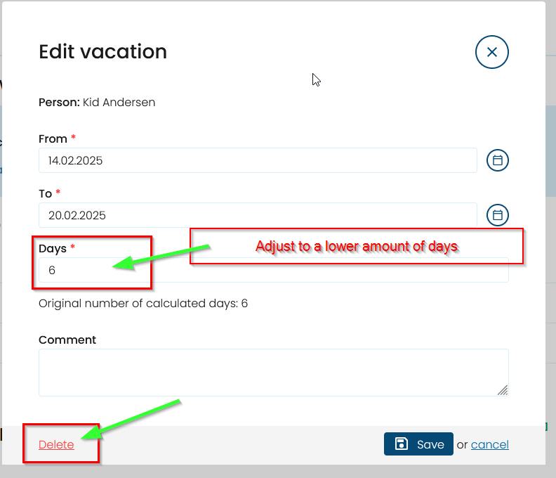 Du kan slette hele søknaden og deretter registrere nye perioder som samsvarer med de faktiske feriedagene som er tatt.