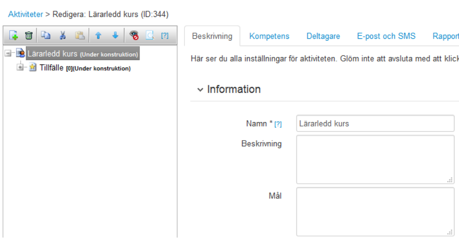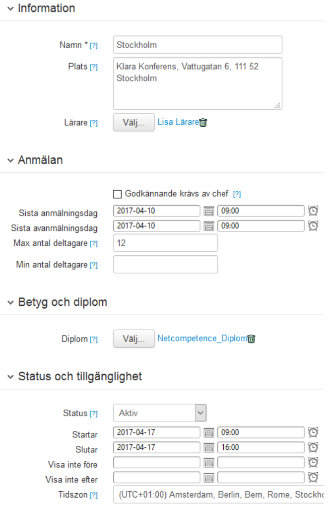 Et tilfelle inneholder informasjon om det som er spesifikt for selve kurset, f.eks. tid, sted og lærer.