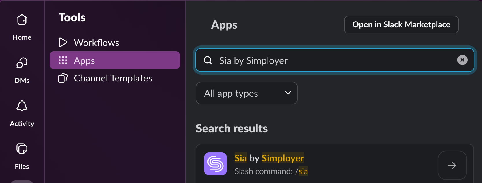 1. Gå til Verktyg > Apps i Slack, og søk etter Sia by Simployer. Hvis du ikke finner Sia, kan det hende at integrasjonen ennå ikke er aktivert for organisasjonen din.