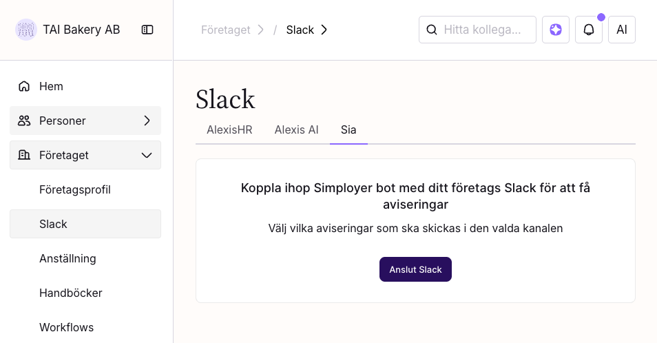 Gå till Företaget > Slack > Sia i Simployer One