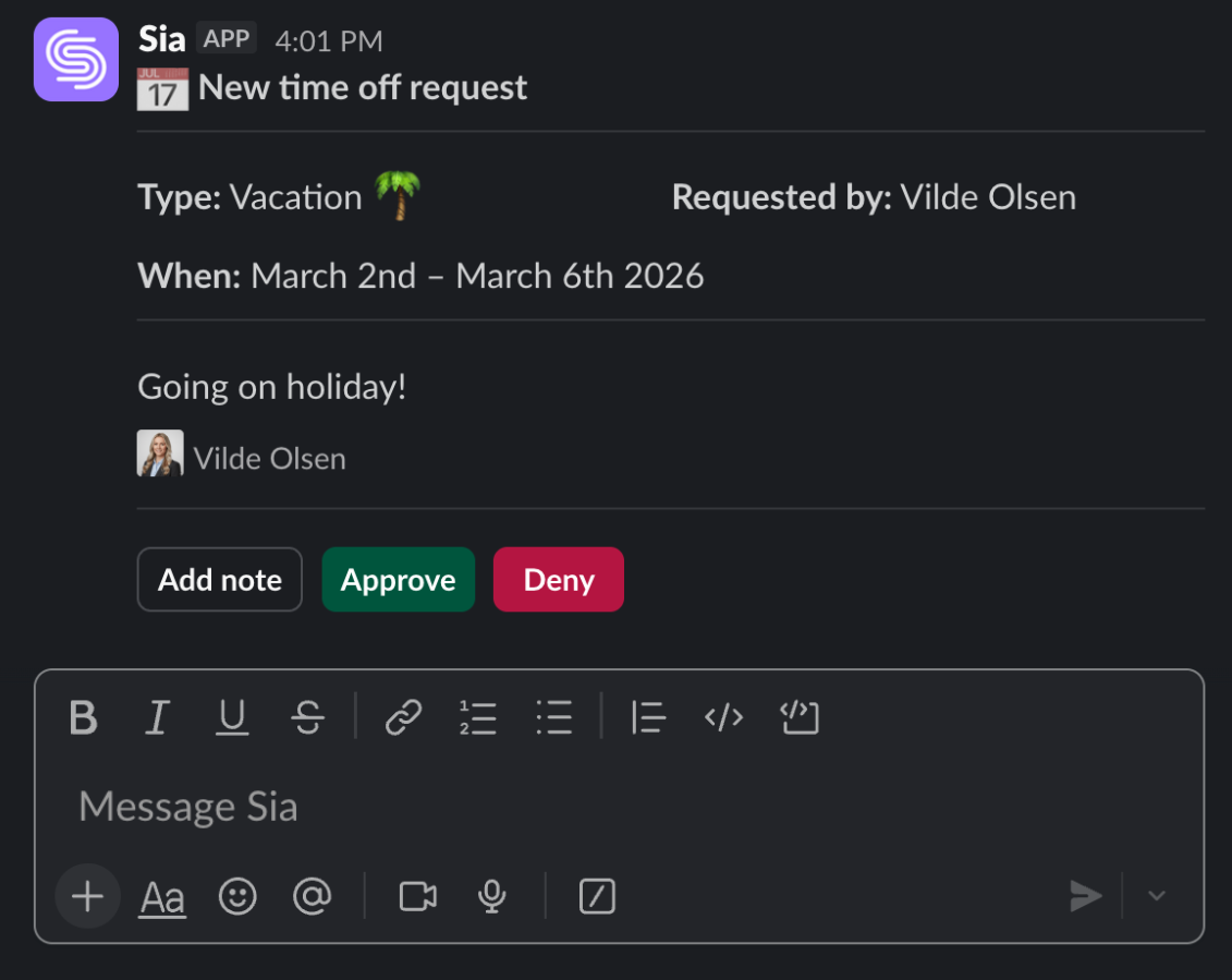 Om en medarbetare skickar in en ledighetsansökan kan Sia meddela dig direkt i Slack. Du kan godkänna eller avslå ansökan direkt i meddelandet.